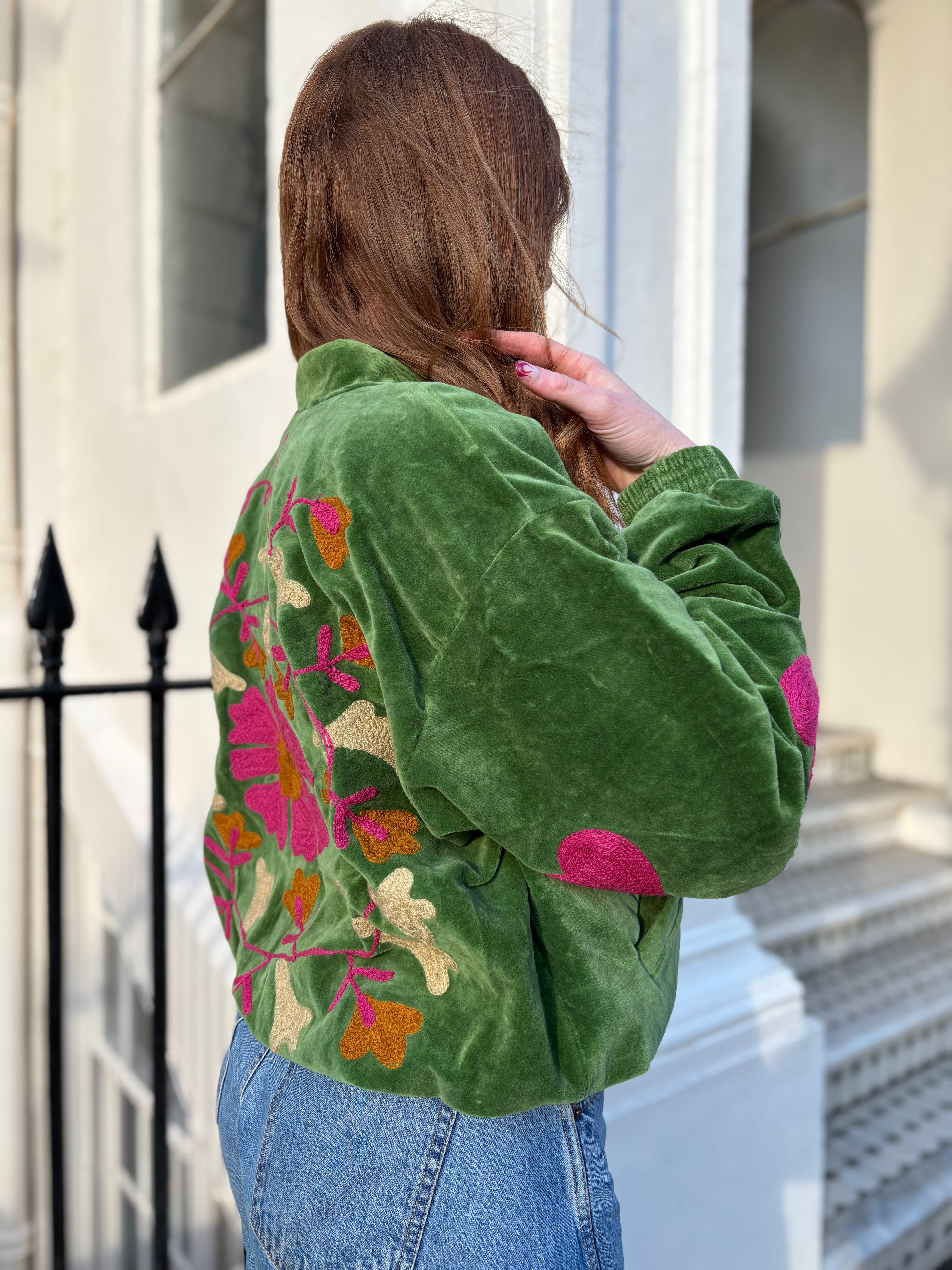 Made from 100% cotton velvet, these bomber jackets were designed on the shape of a 90's bomber I picked up at the car boot. They have a striped cotton lining and are adorned with hand embroidery. Lovingly made in Jaipur they come in three sizes, M L and XL.