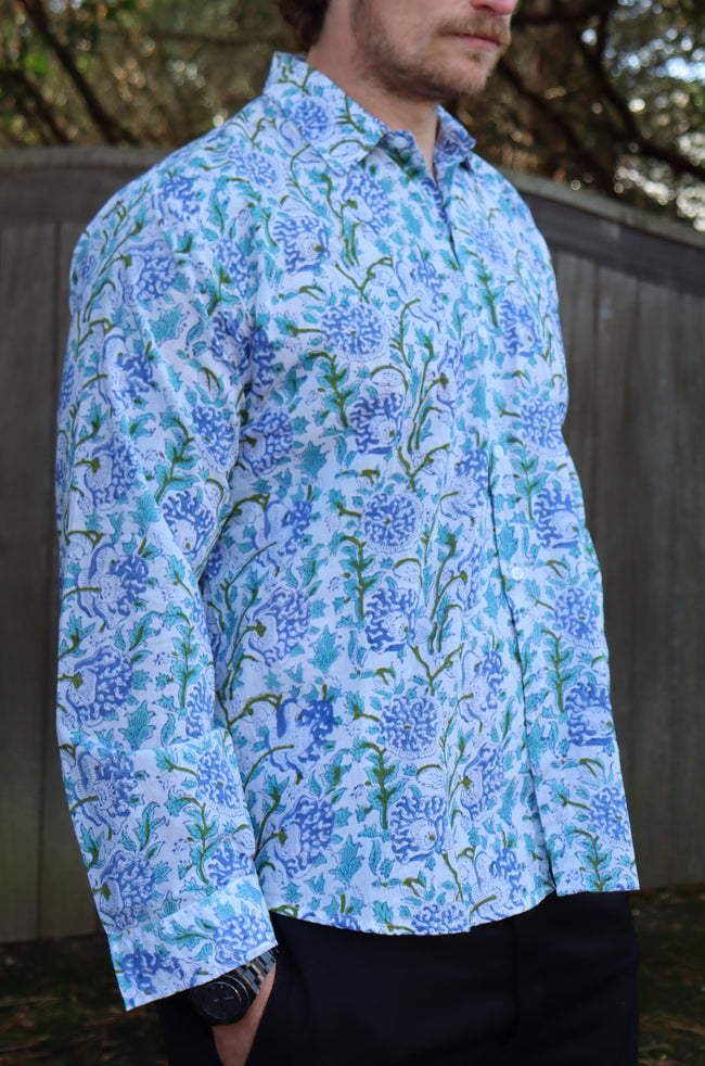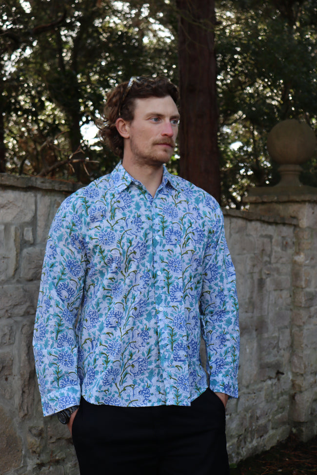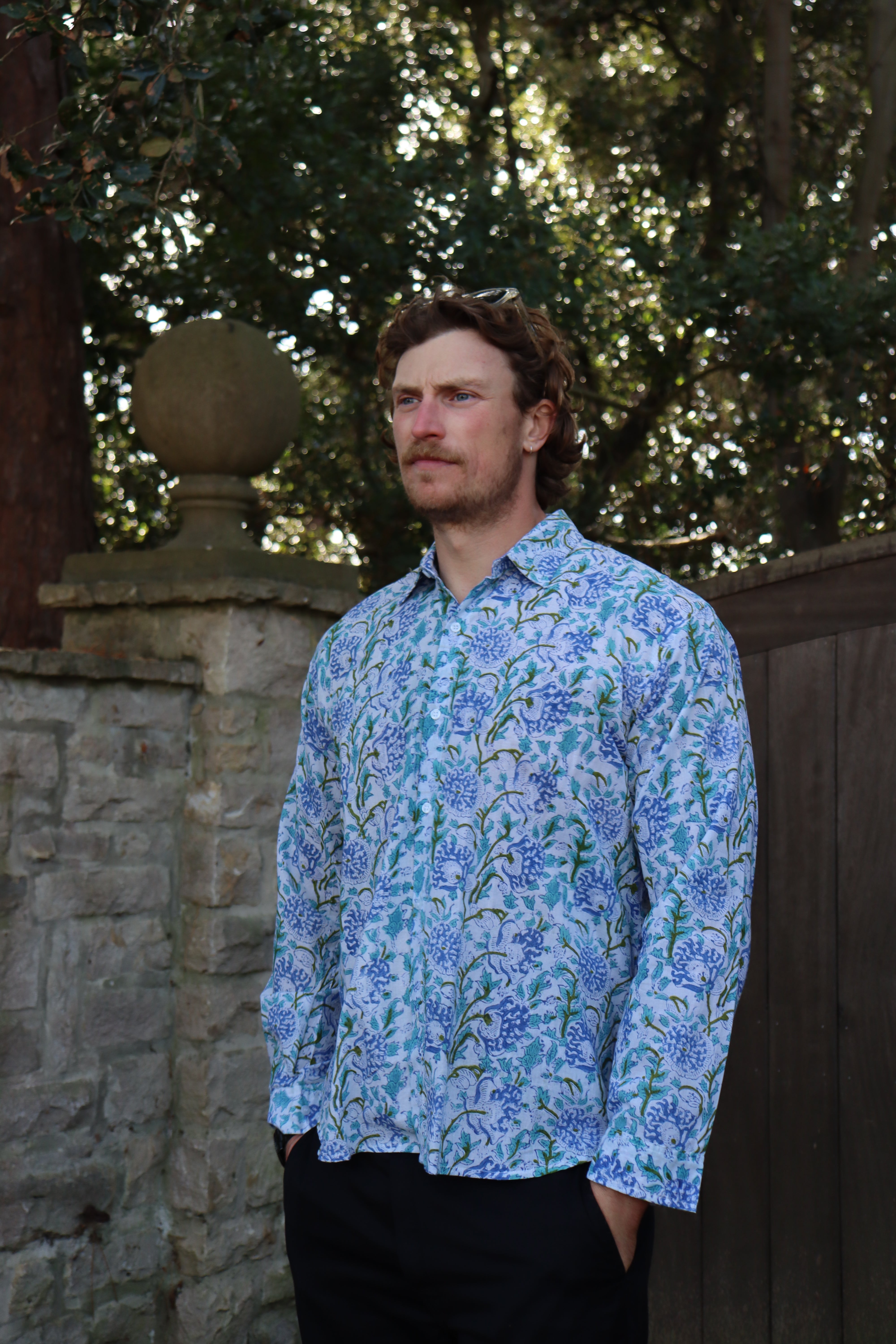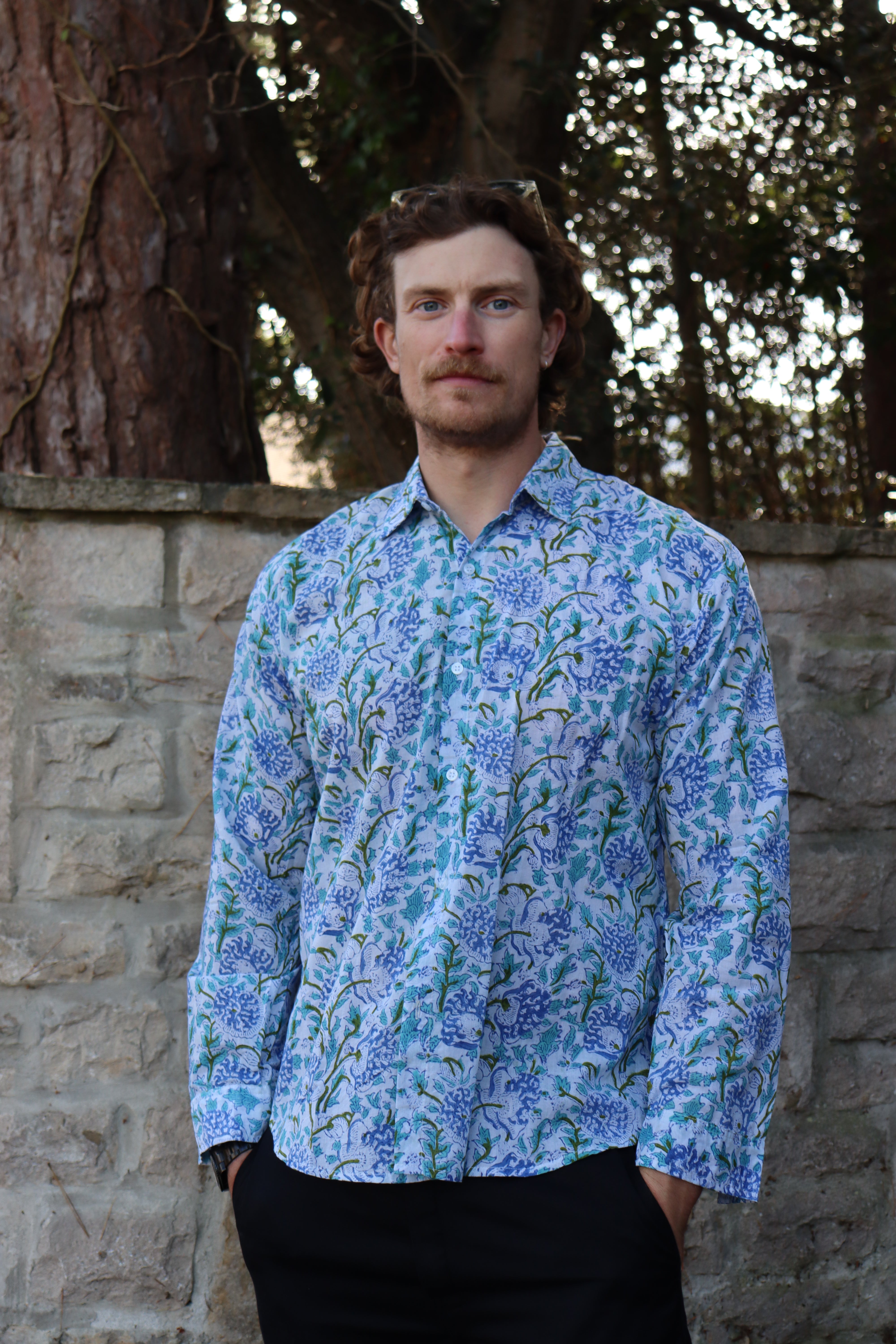 Our lightweight organic cotton shirts are hand printed and use environmentally friendly vegetable dyes. Perfect over the summer months with the versatility to take you into the colder seasons too. Fits true to size. Wash at a low temperature, and due to their natural cotton composition there's no need to iron - just hang dry!
