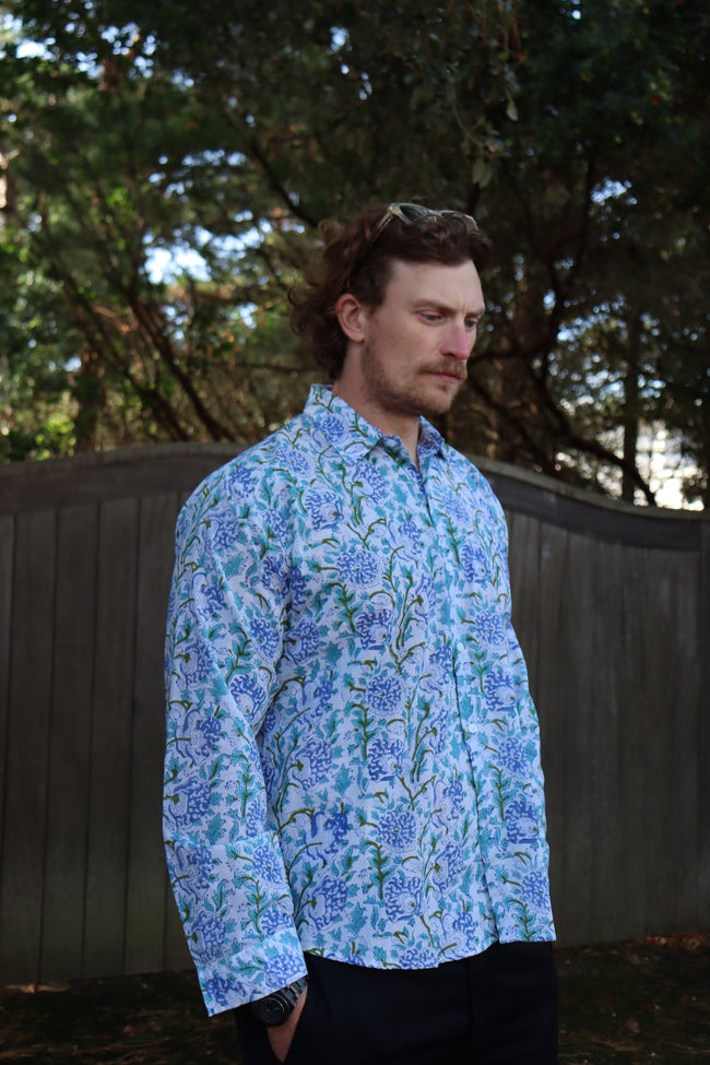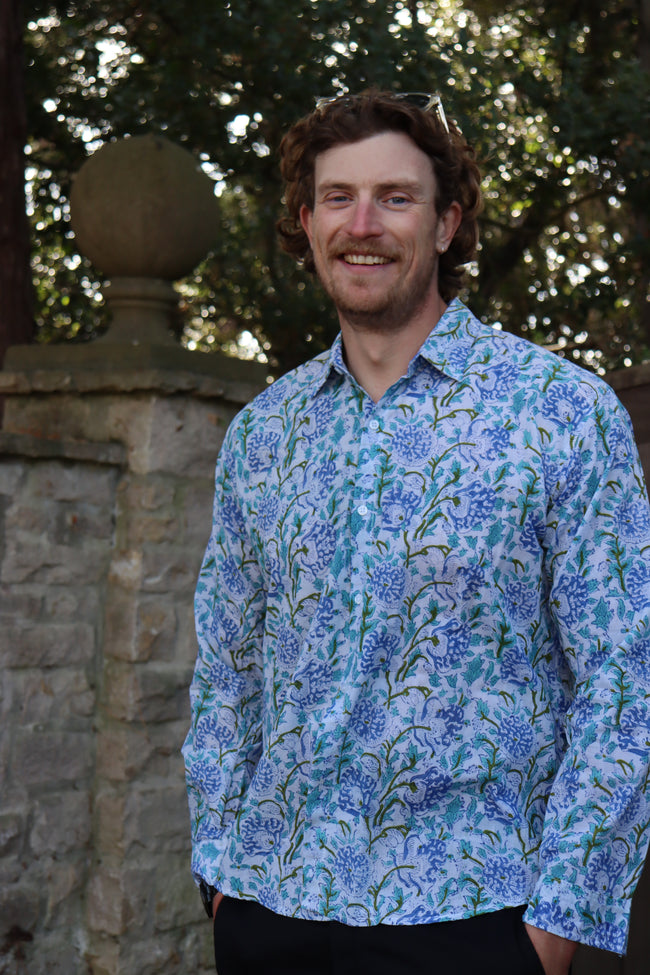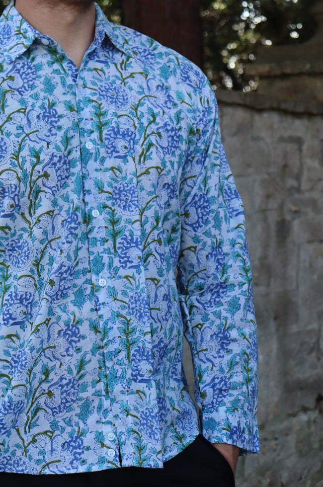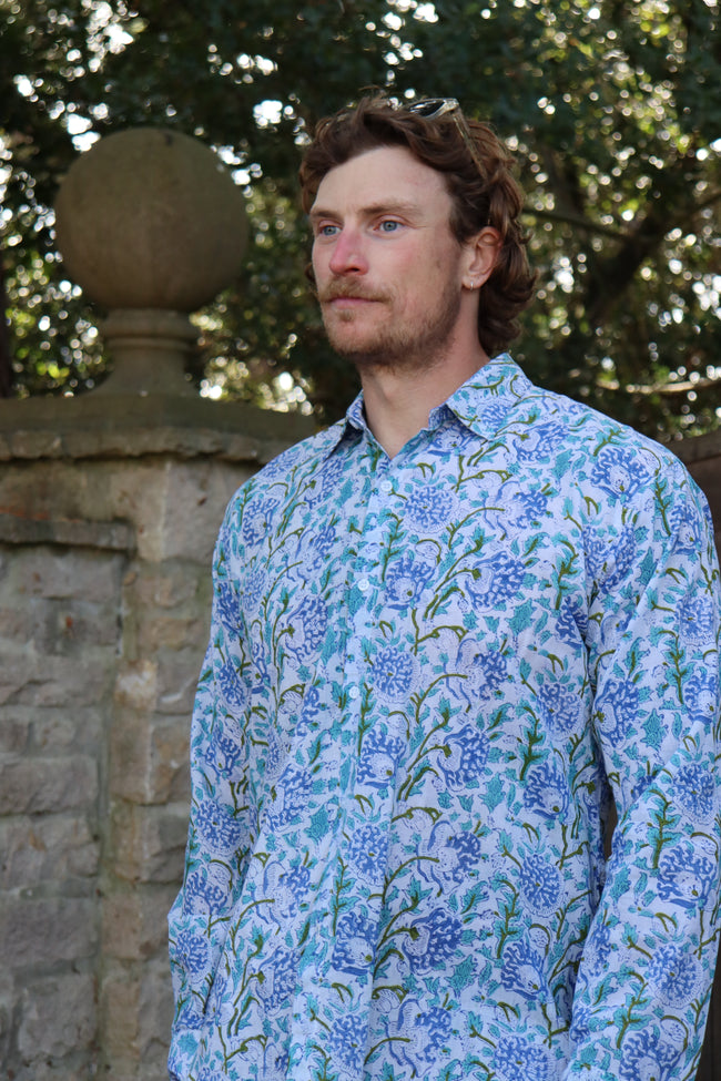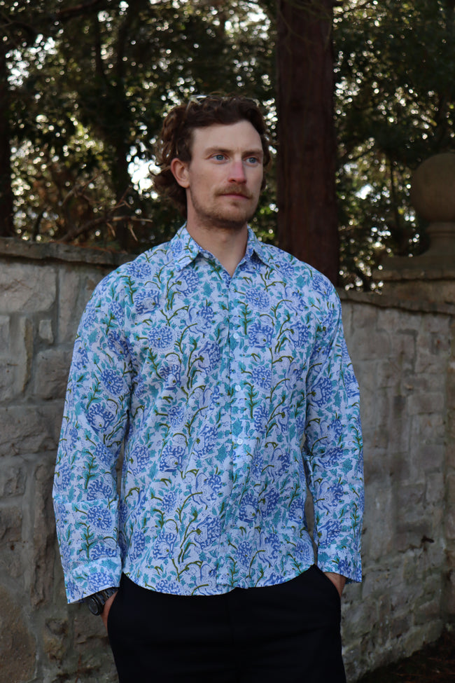 Our lightweight organic cotton shirts are hand printed and use environmentally friendly vegetable dyes. Perfect over the summer months with the versatility to take you into the colder seasons too. Fits true to size. Wash at a low temperature, and due to their natural cotton composition there's no need to iron - just hang dry!