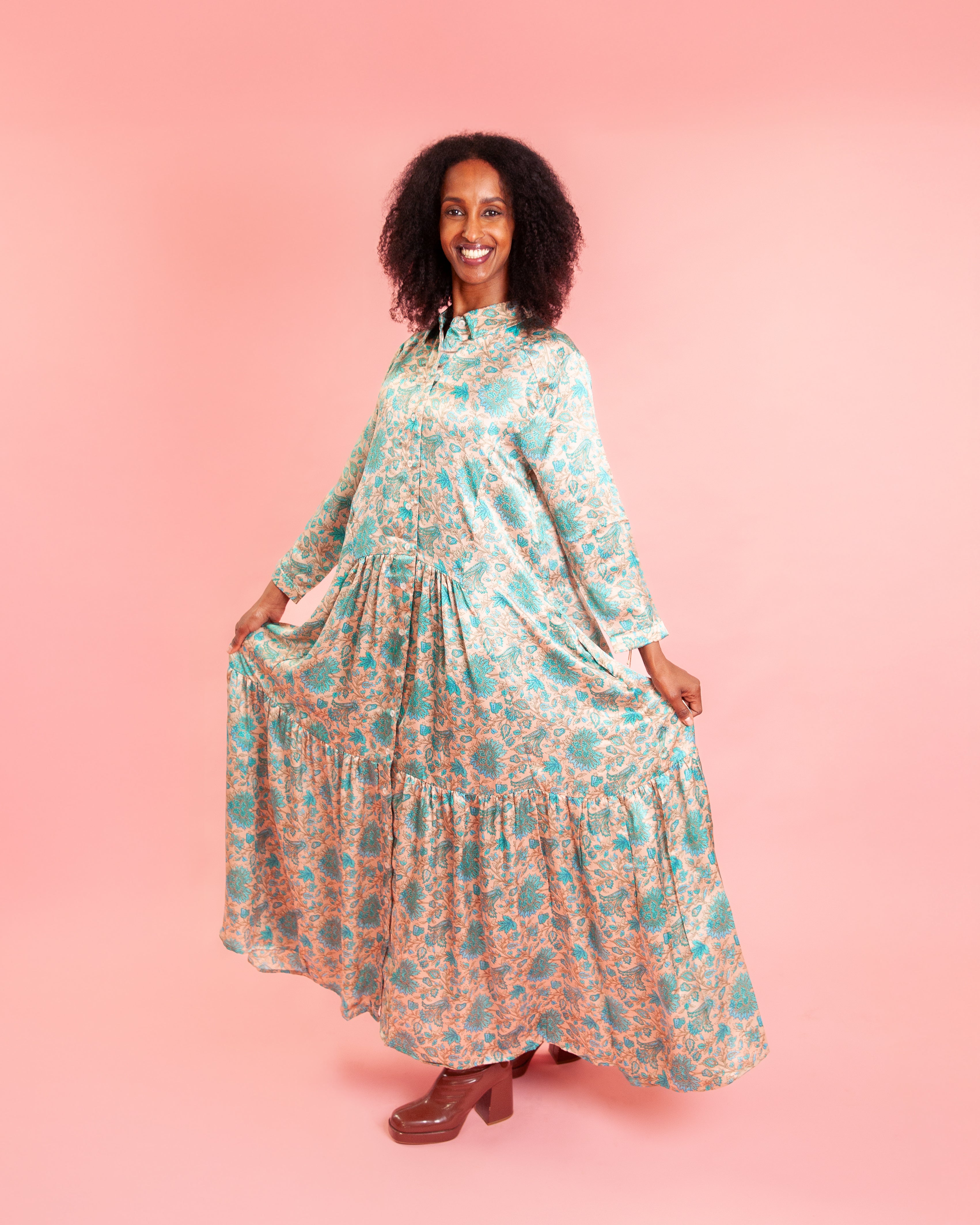 Our 100% silk shirt dresses are made from end of roll silks so we only have a couple made in each pattern - meaning once a pattern is sold out it's GONE. They come with handy little pockets and are a one size fits all for most - they will fit from a size 6 to a 16 comfortably.