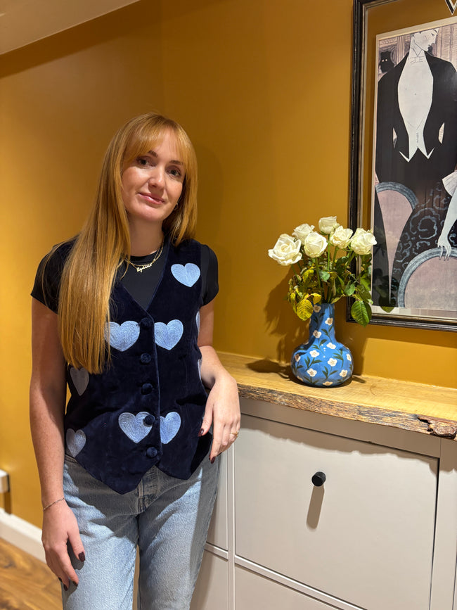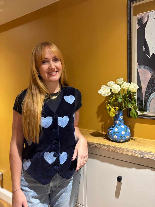 Made from 100% cotton velvet with a matching cotton lining, these sweetheart waistcoats have embroidered heart motifs and a waist clinching buckle at the back.