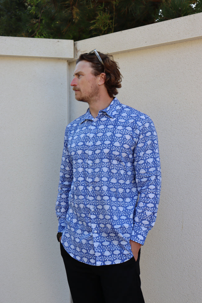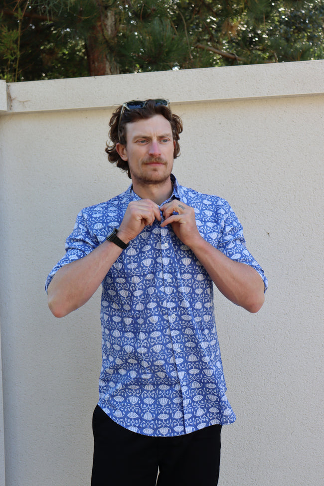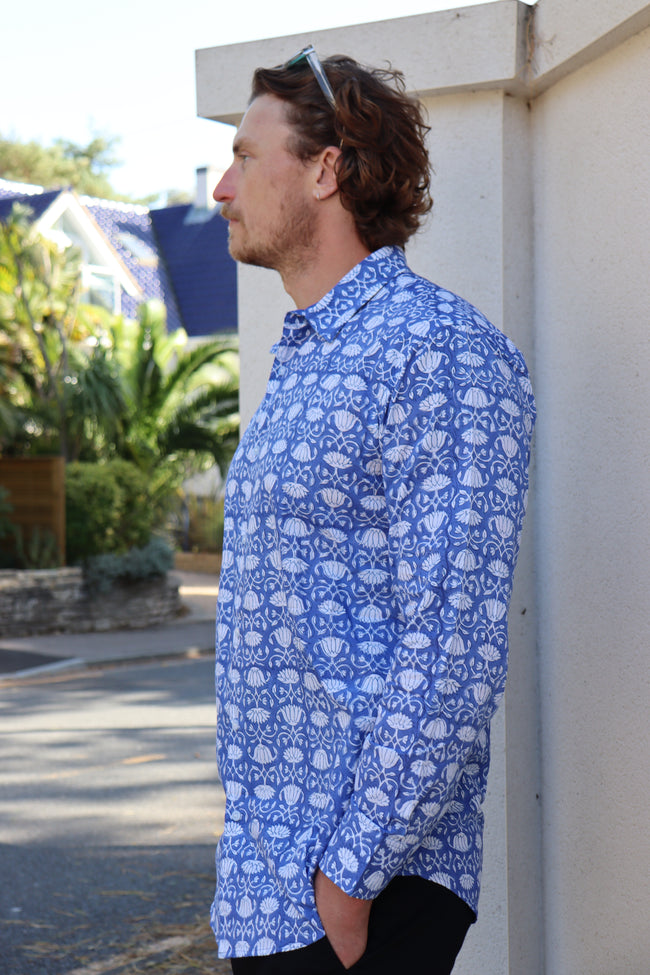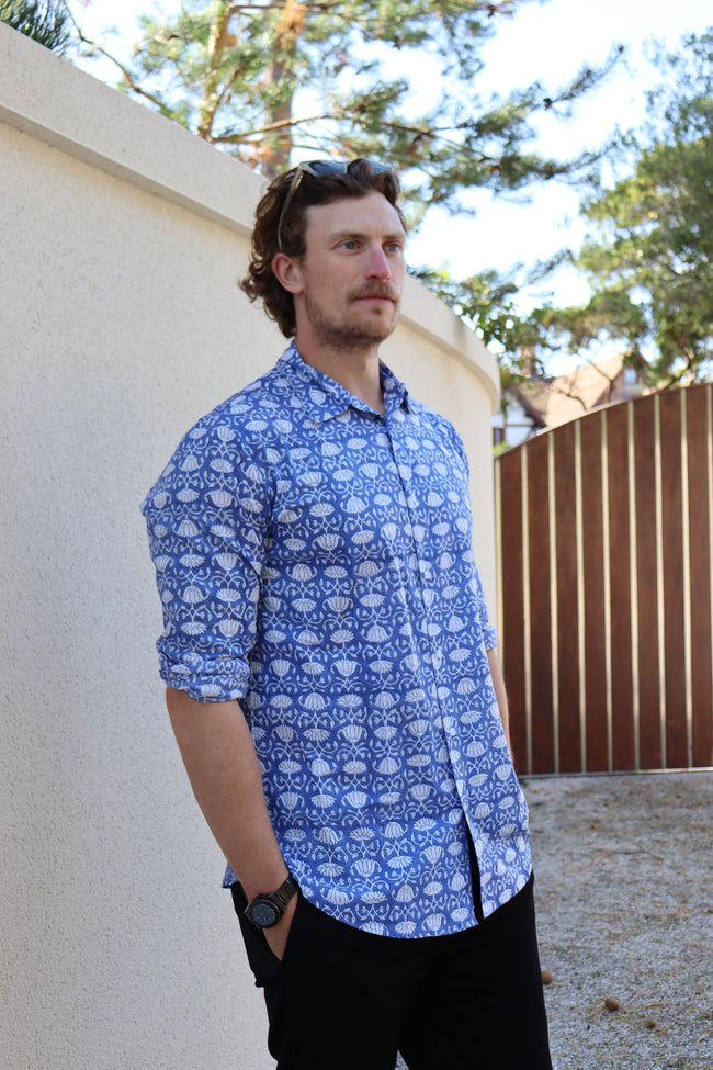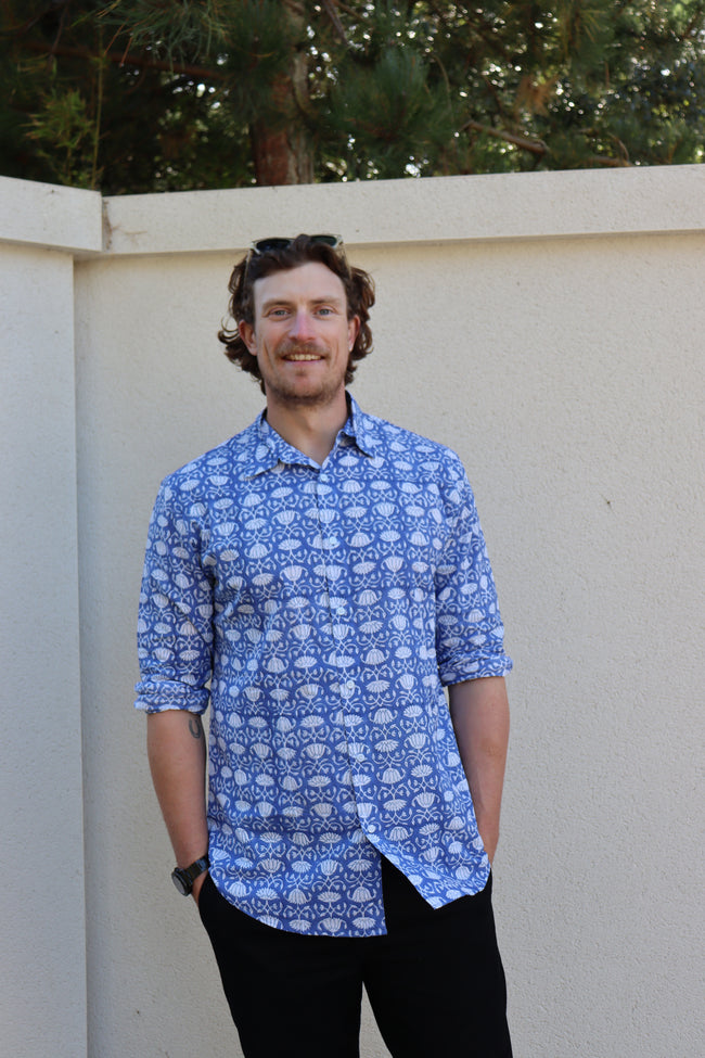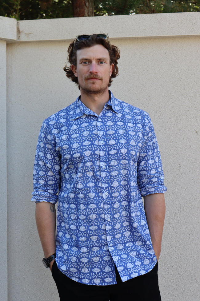 Our lightweight organic cotton shirts are hand printed and use environmentally friendly vegetable dyes. Perfect over the summer months with the versatility to take you into the colder seasons too. Fits true to size. Wash at a low temperature, and due to their natural cotton composition there's no need to iron - just hang dry!